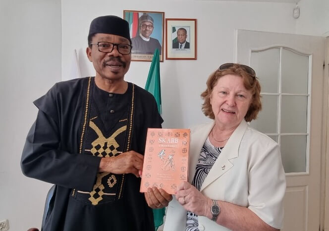 - Prof. Nina Pawlak presents her book to H.E. Ambassador of Nigeria